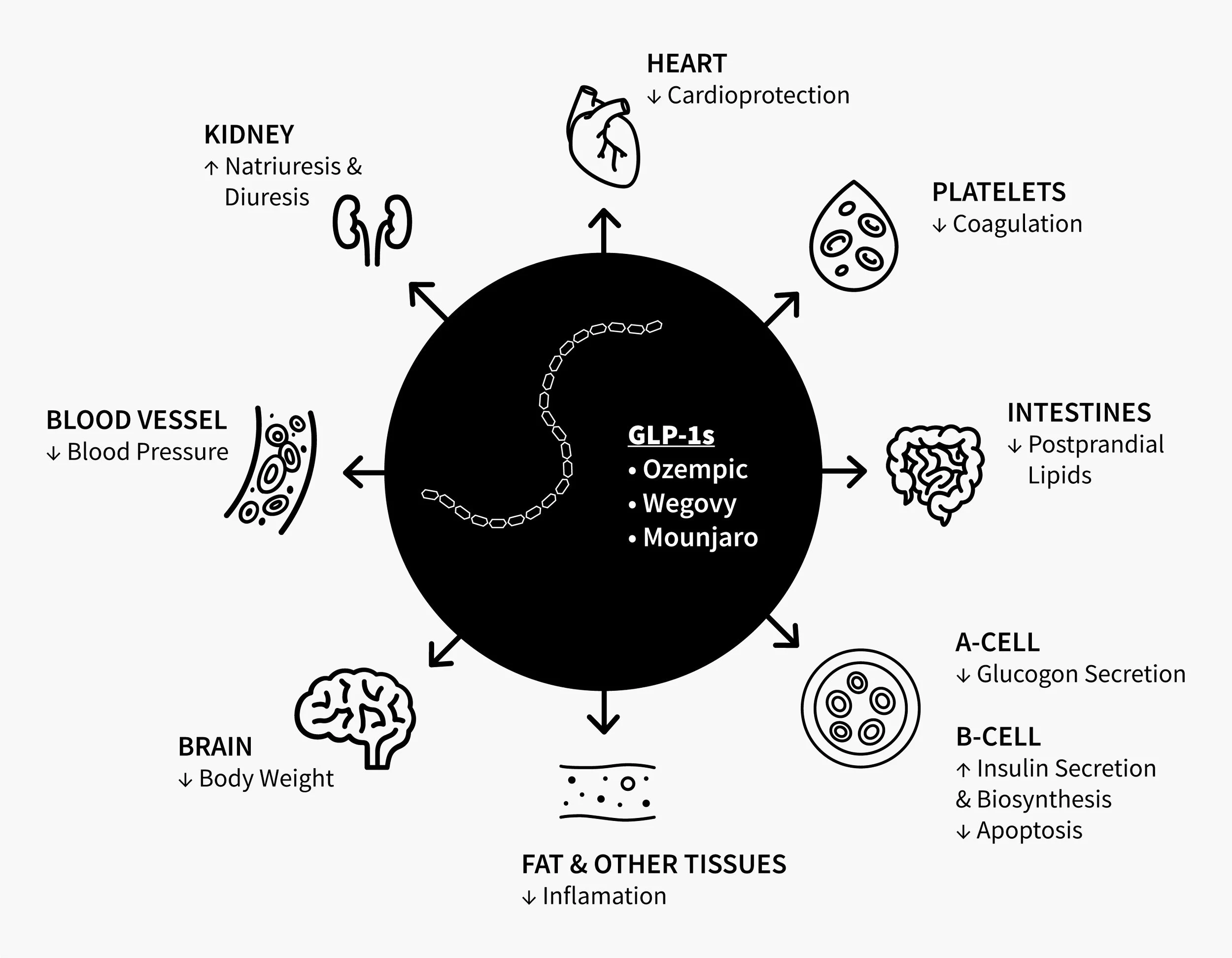 GLP-1s stimulate the secretion of insulin and slow the release of glucagon, thereby keeping blood sugar low. This effect on blood sugar facilitates lipolysis or fat-burning.